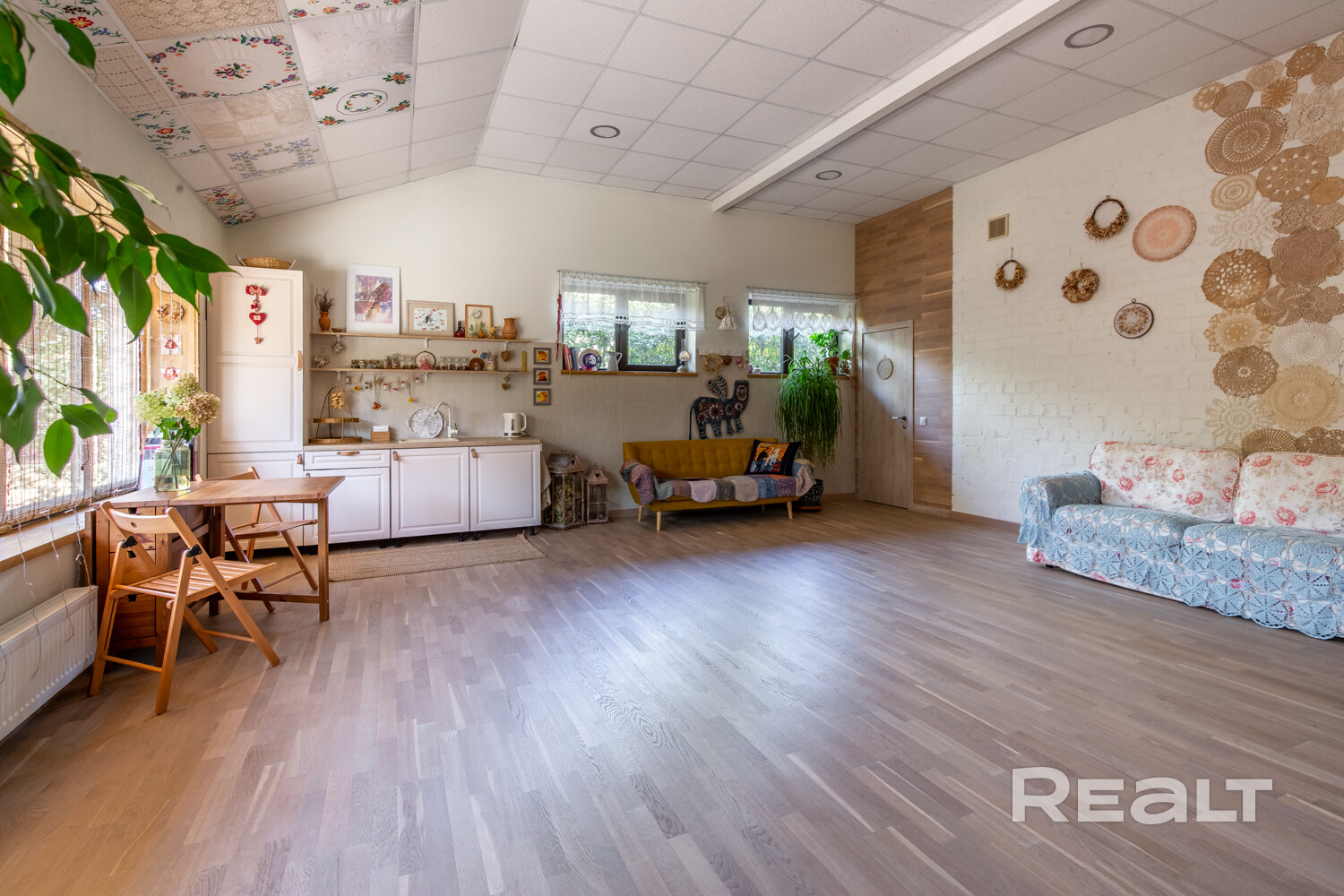 Дополнительный бонус этого дома большое уютное пространство, расположенное с парадного входа, величиной 44 кв м, с потолками 3.25 м. Здесь имеется отдельный сан. узел и бойлер для горячей воды. Оно обустроено из бывшего помещения гаража, оборудовано и используется как место для клубных встреч. Можно проводить здесь сборы небольших коллективов 10-15 человек для занятий спортом, творчеством, рукоделия.
