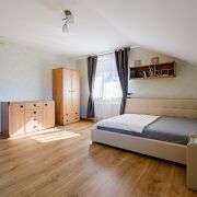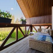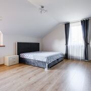 Площадь дома 185,2 кв.м. состоит из - 1 этаж: просторная гостиная (45 кв.м.) в которой расположен камин и зона отдыха – панорамные окна в пол и выходом на зеленую зону придомовой территории, кухня с обеденной зоной (14 кв.м.), спальня (18,7 кв.м.), топочная и гостевой сан.узел; 2 этаж: просторные две спальни (21,8 кв.м, 21,7 кв.м.), гардеробная (4,5 кв.м.), просторный сан.узел (12,1 кв.м.), выход на балкон, где можно наблюдать за прекрасными закатами.