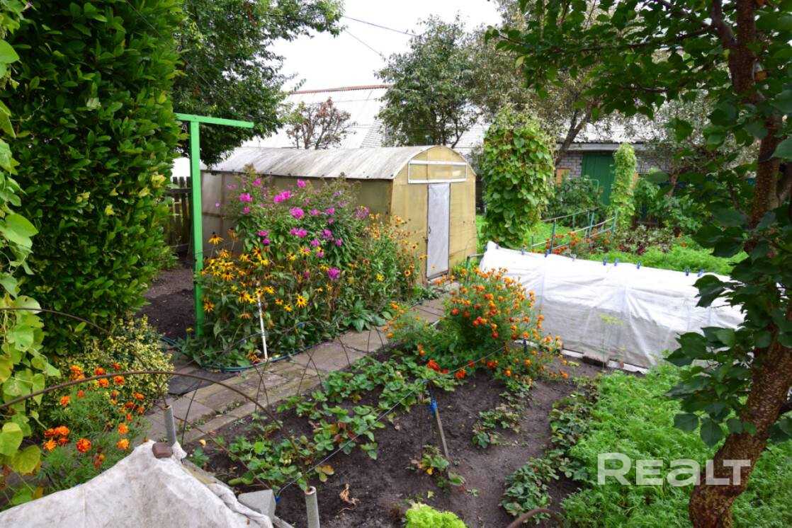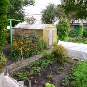 На участке высажены плодово-ягодные деревья и кустарники (яблоки, абрикосы, вишни, виноград). Стоит теплица, почва - плодородная. С огорода всегда хороший урожай. Много красивых цветов.