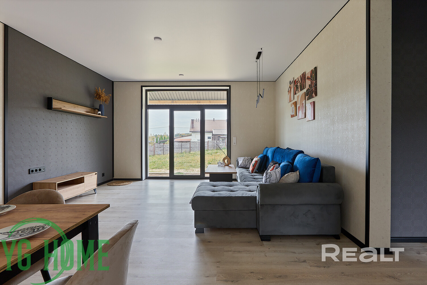 В коттедже: гостиная с выходом на террасу  -  27 кв.м, 3 отдельные спальни (10,3, 15,4, 14,4 кв. м.), кухня - 15,4 кв.м, 2 санузла, топочная.