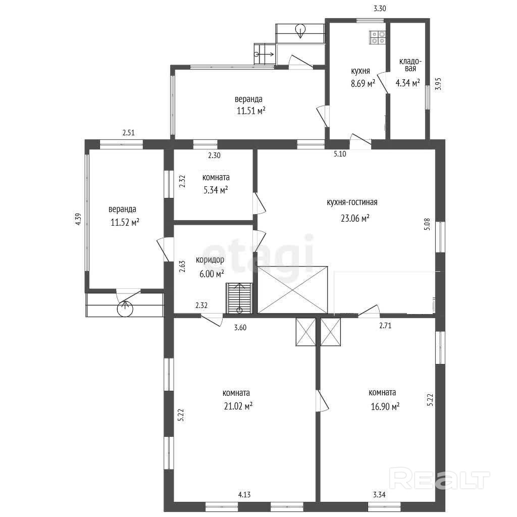 Дом 1960 года постройки, общей площадью 106,38 кв.м. Состоит из 4-х жилых просторных комнат, двух летних веранд, летней кухни с кладовой и кухни-гостинной 21,06 кв.м. Жилые комнаты: 21,06 кв.м., 21,02 кв.м., 16.9 кв.м., 5,34 кв.м.
