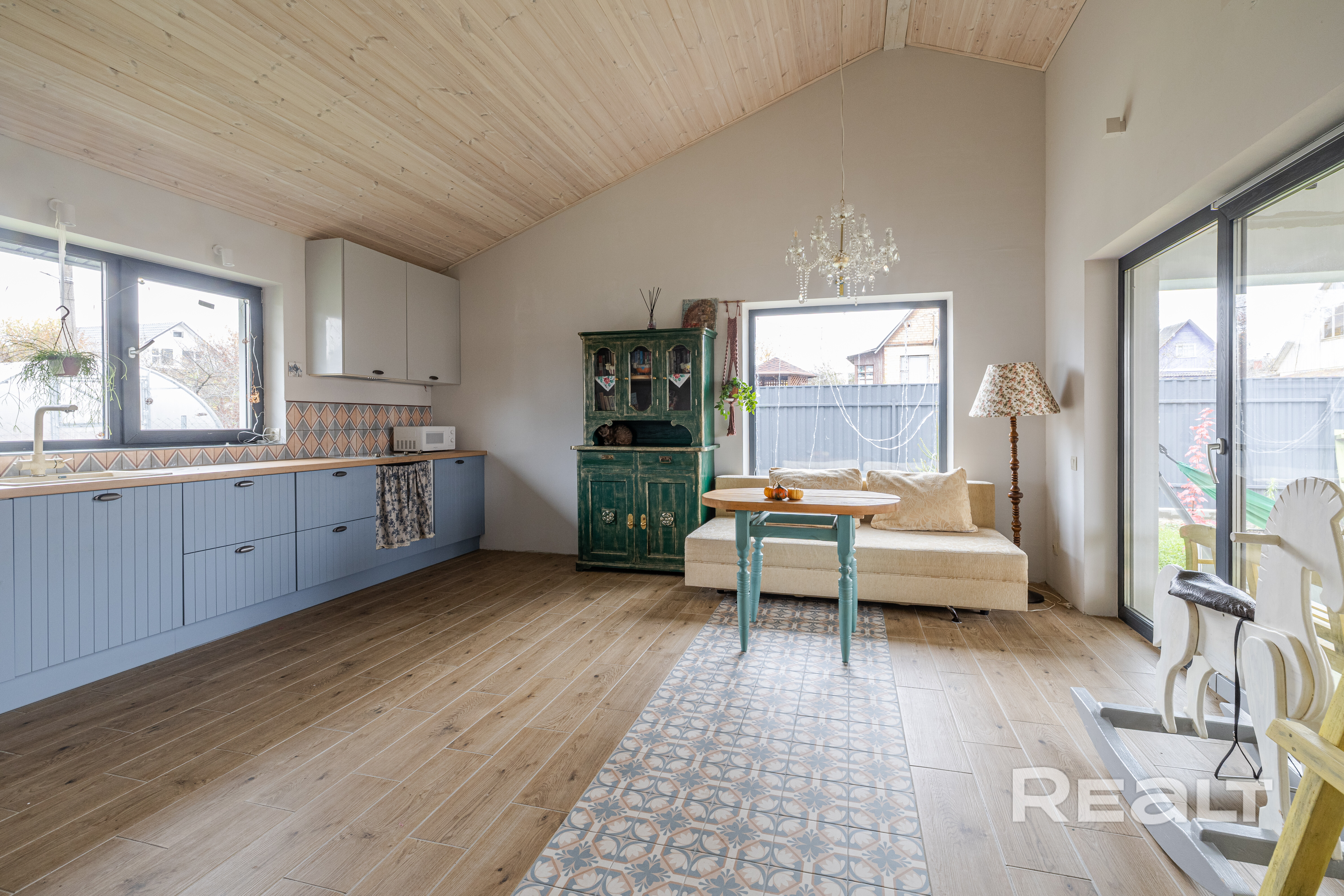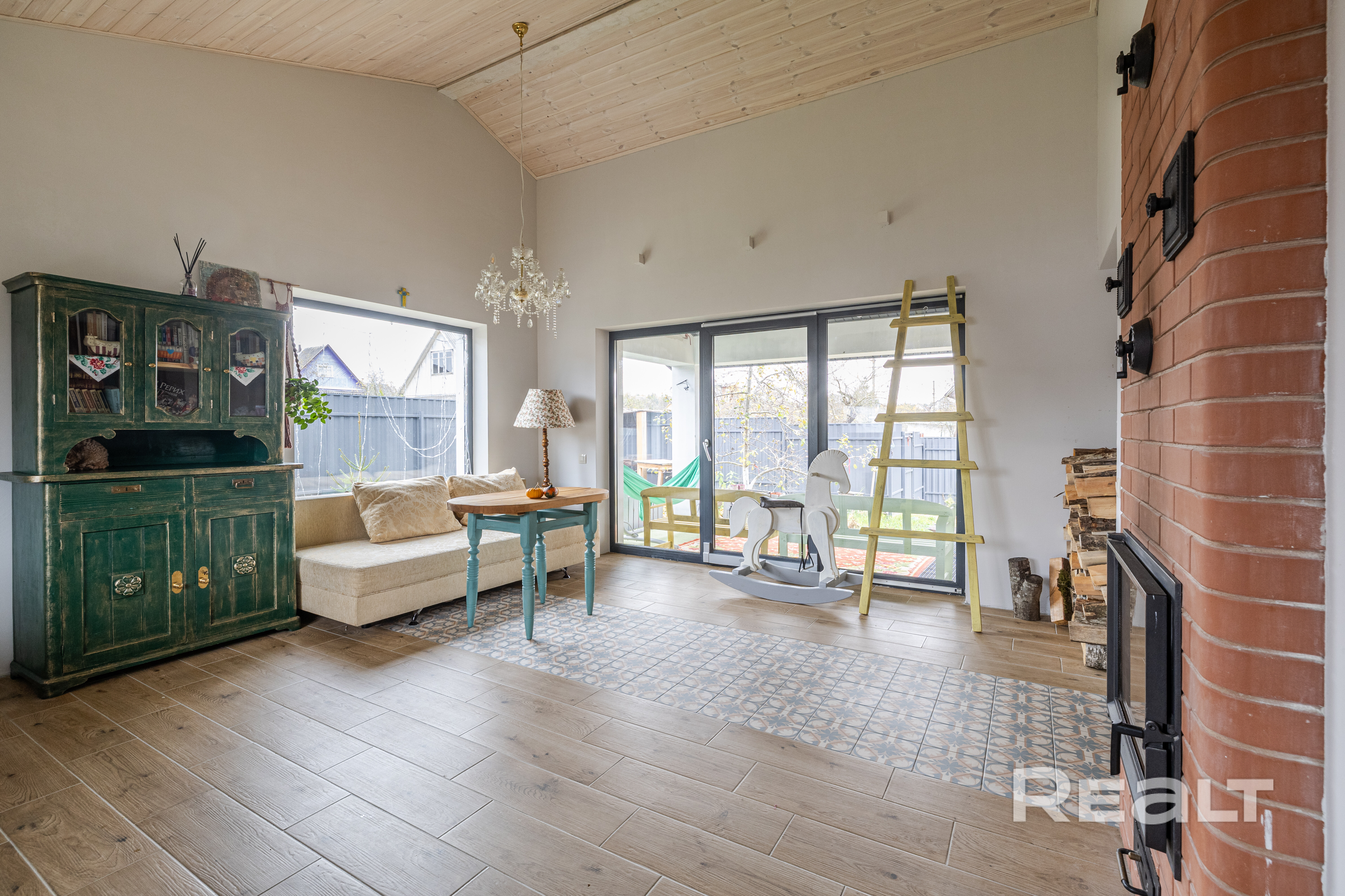• Гостиная: Просторная 22,9 м2, с красивой печью-камином и выходом на большую открытую террасу с вечерней подсветкой.