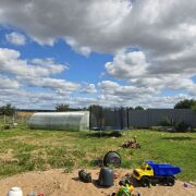 На участке установлено детское оборудование и имеется прекрасный парник из поликарбоната.