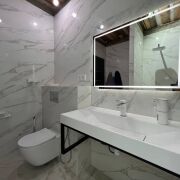 Хозяйский санузел оборудован отдельной ванной, безбарьерной душевой зоной с лейкой тропического ливня, унитазом с инсталляцией и псевдо биде, умывальником.