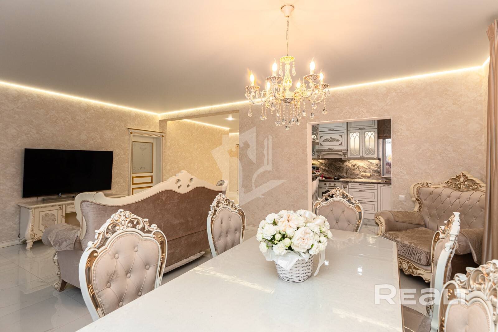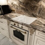 На полу – крупноформатный керамогранит. Роскошный мраморный рисунок придаёт ещё больше объёма пространству.