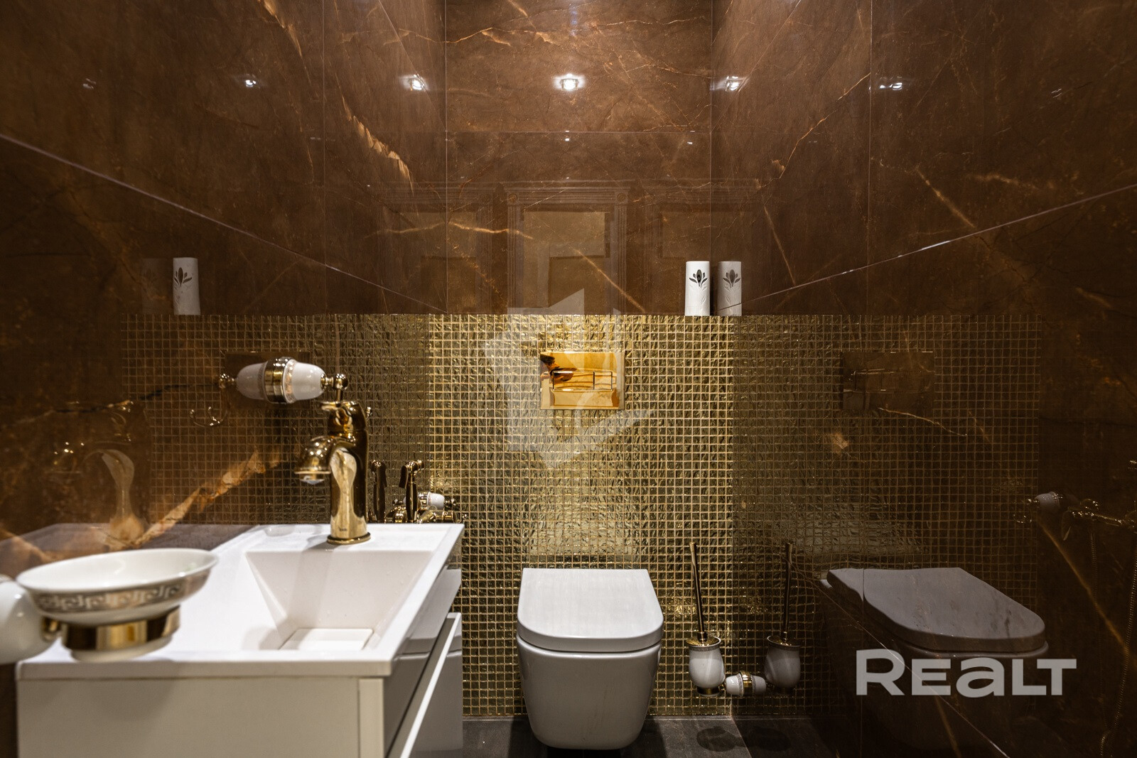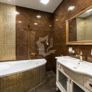 Сан. узлы облицованы также керамогранитом, коллекция Armani. Изюминку отделке придаёт мозаика.