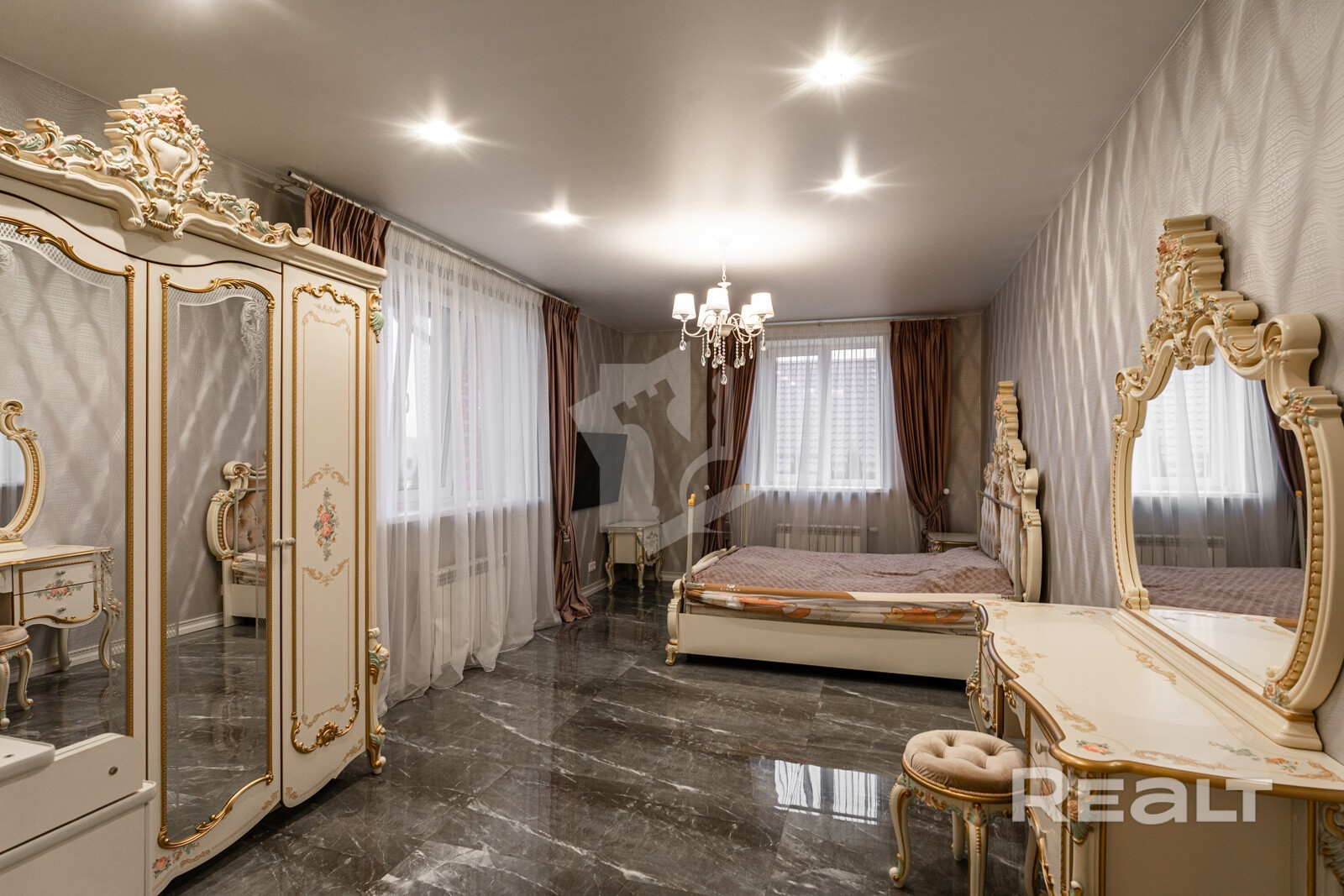 В доме выполнена шикарная дорогостоящая отделка с применением импортных материалов.