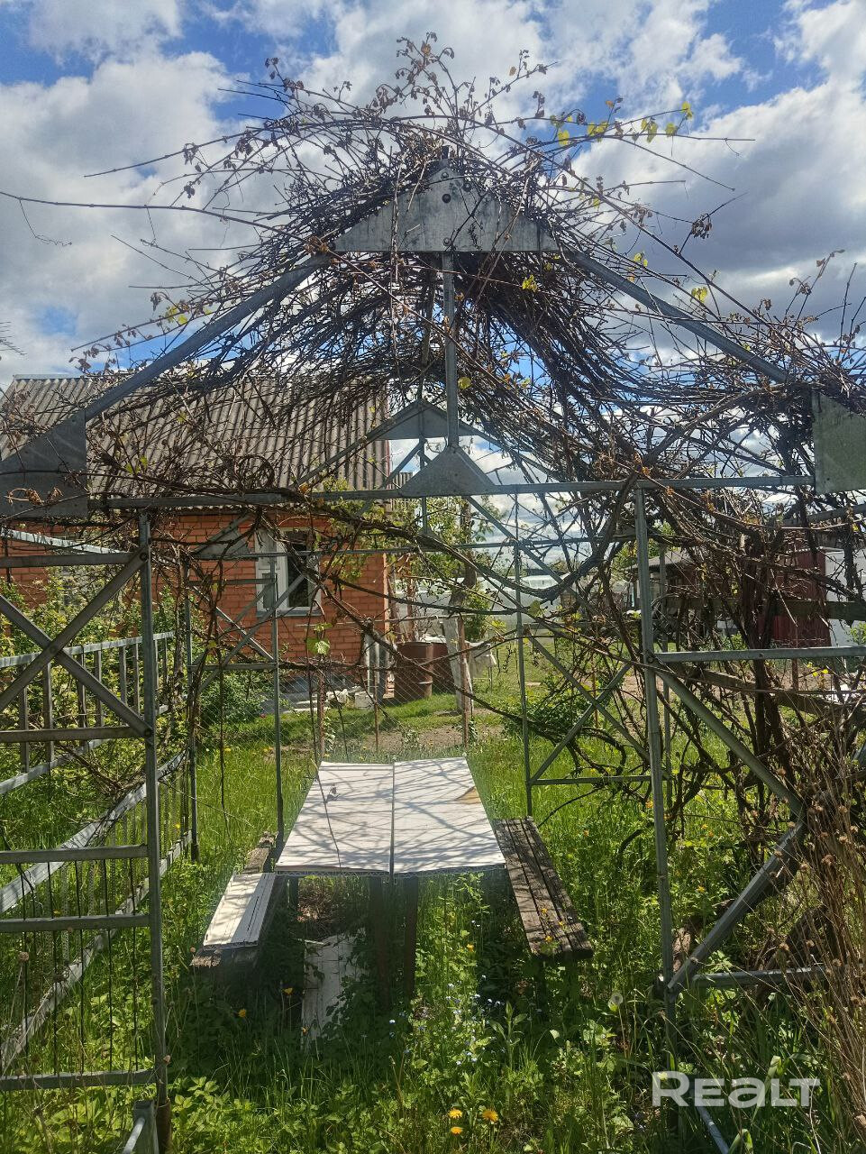 На участке фруктовые деревья и установлен прочный каркас для беседки.