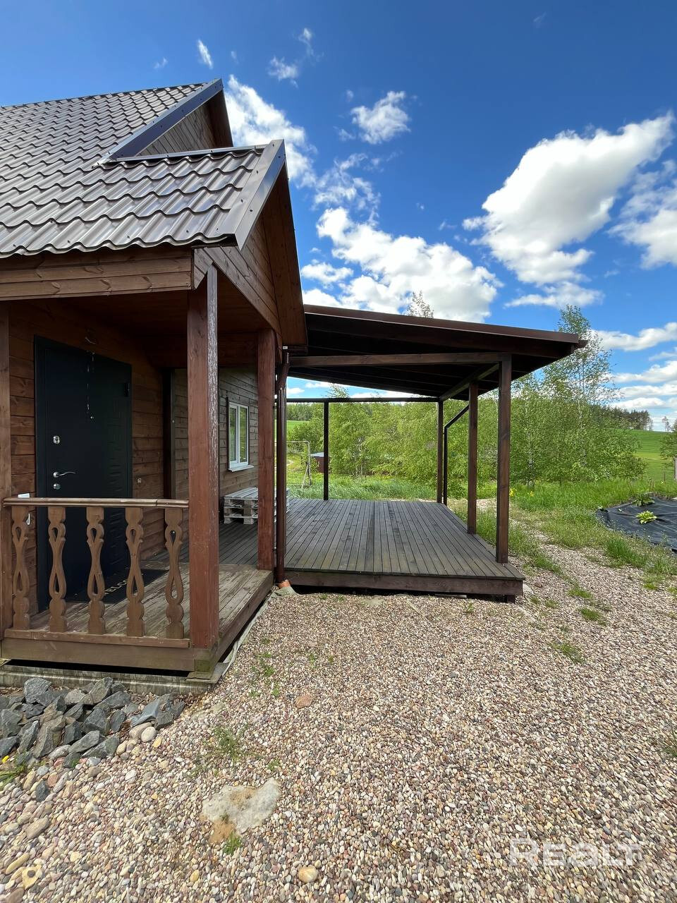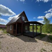 - Двухэтажный деревянный коттедж с просторной крытой террасой – идеально для утреннего кофе или вечерних посиделок.