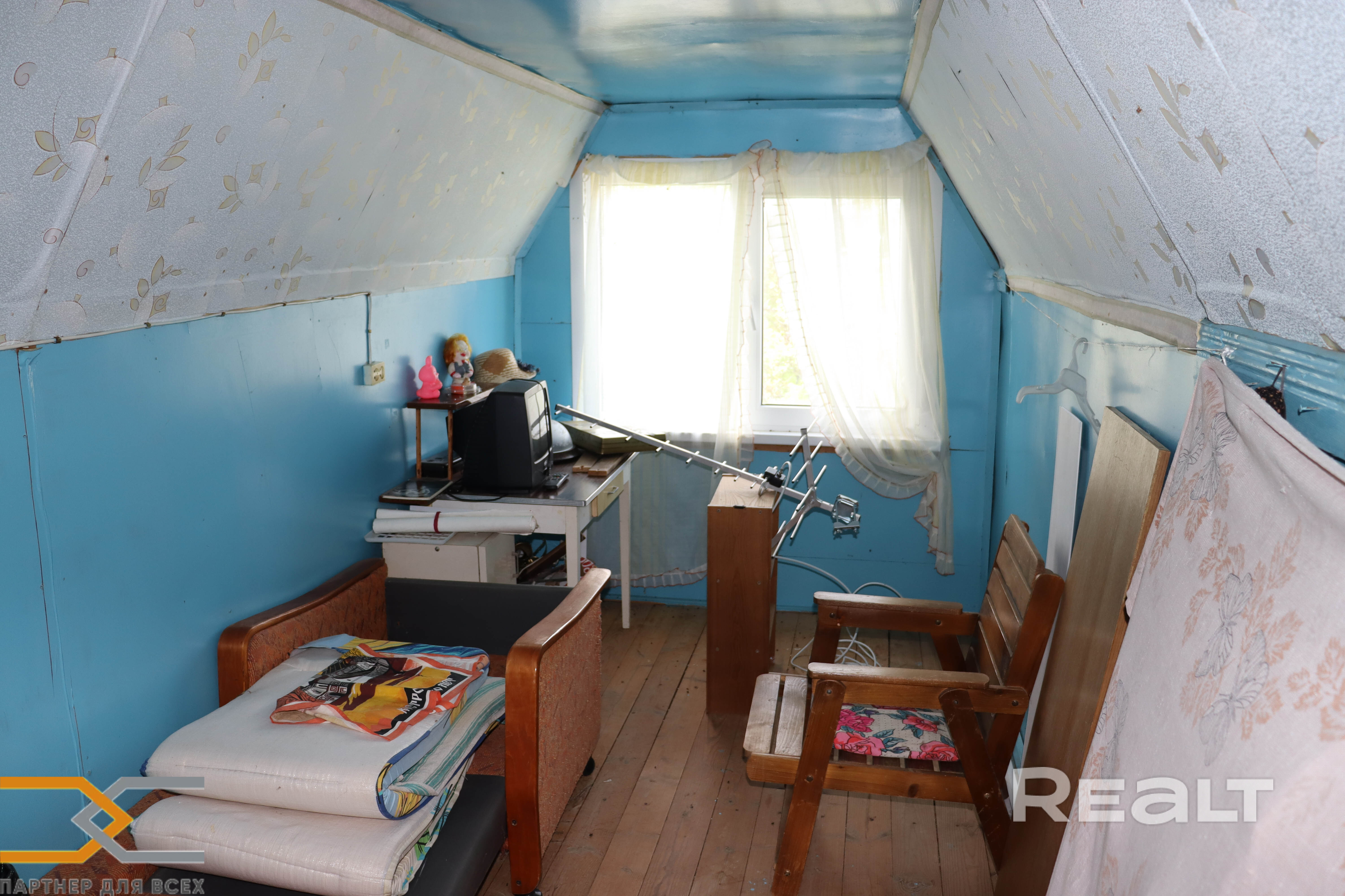 На втором мансардном этаже одна жилая комната. Стены и потолок отделаны ДВП. Окно ПВХ.