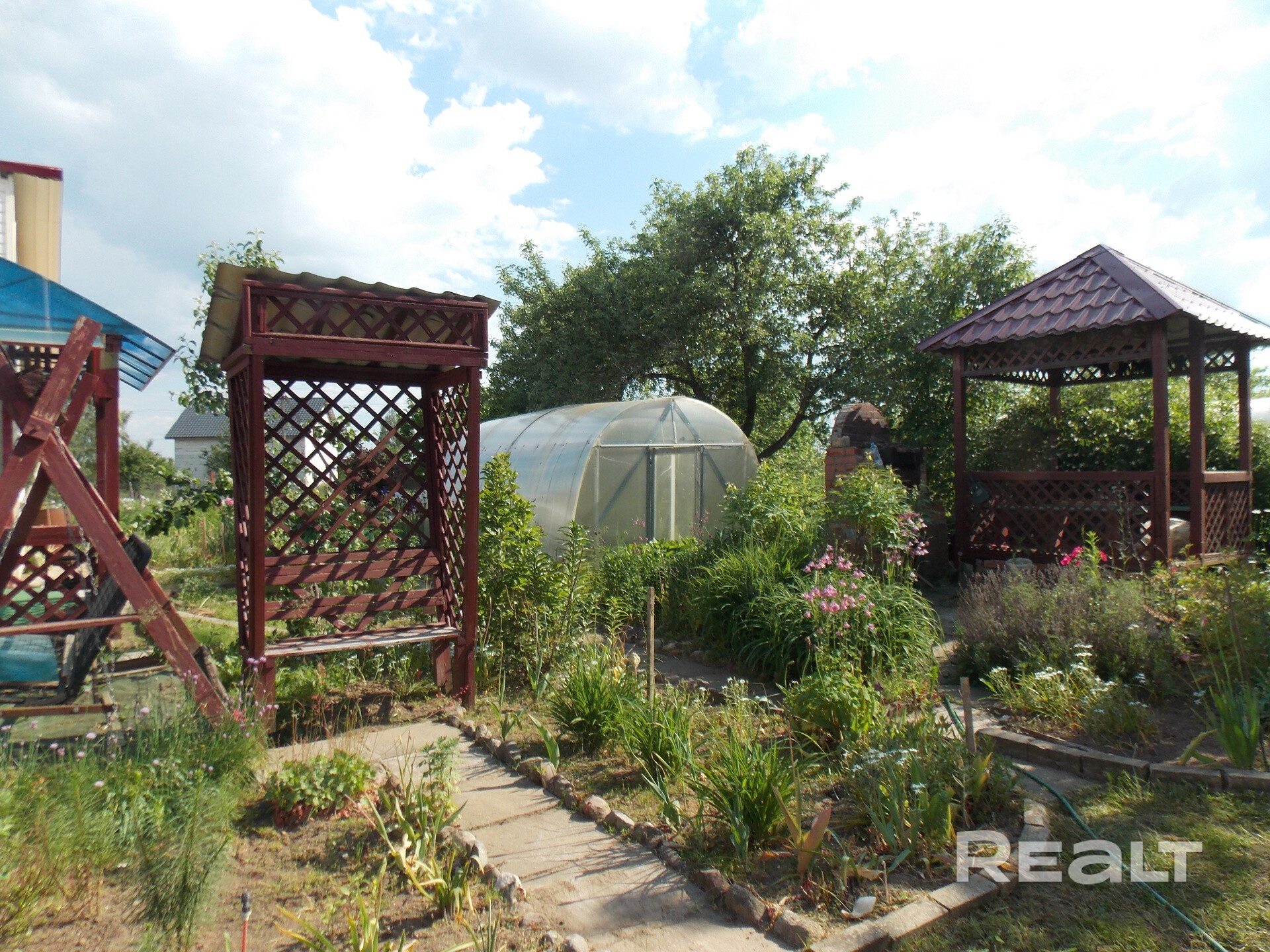 Отличная баня с добротной парилкой, большой комнатой отдыха и санузлом. Есть сарай, беседка, качели, 2 скамейки, мангал, выложены дорожки, 2 больших парника,