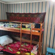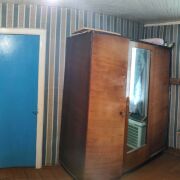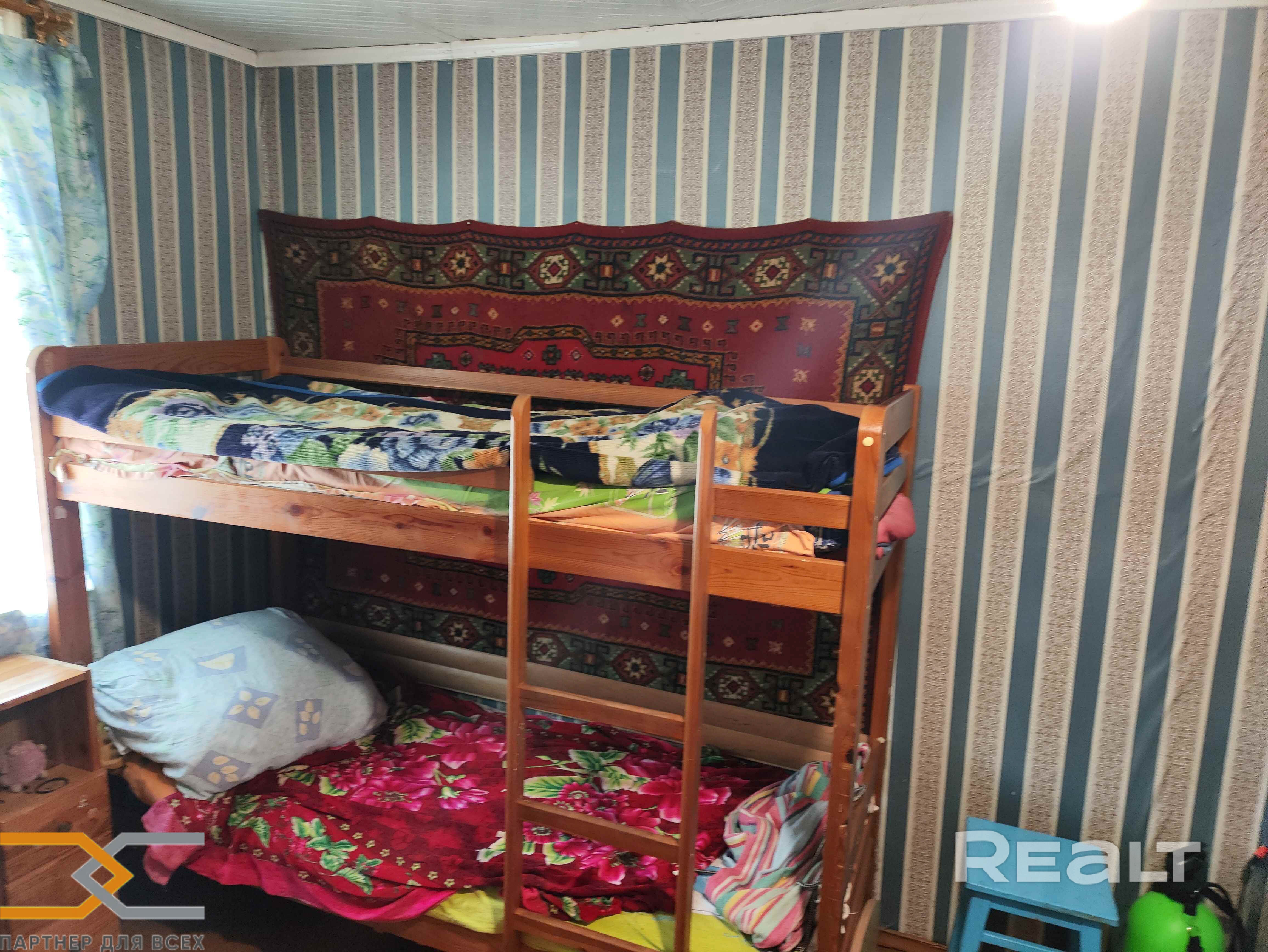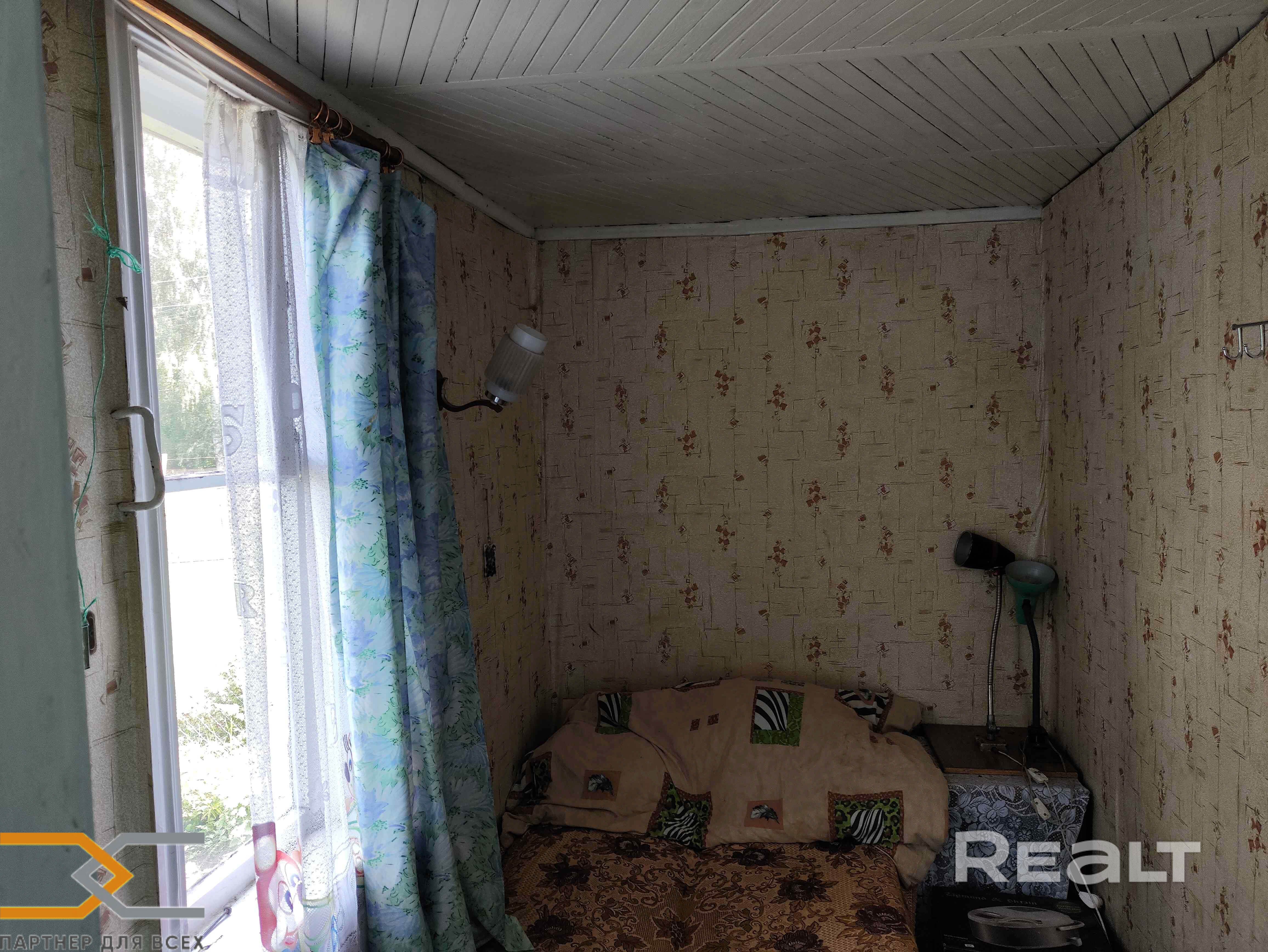 В комнатах потолки также из декоративной вагонки, стены оклеены обоями, на полу доска.