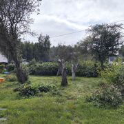На территории растут несколько плодовых деревьев и кустарники.