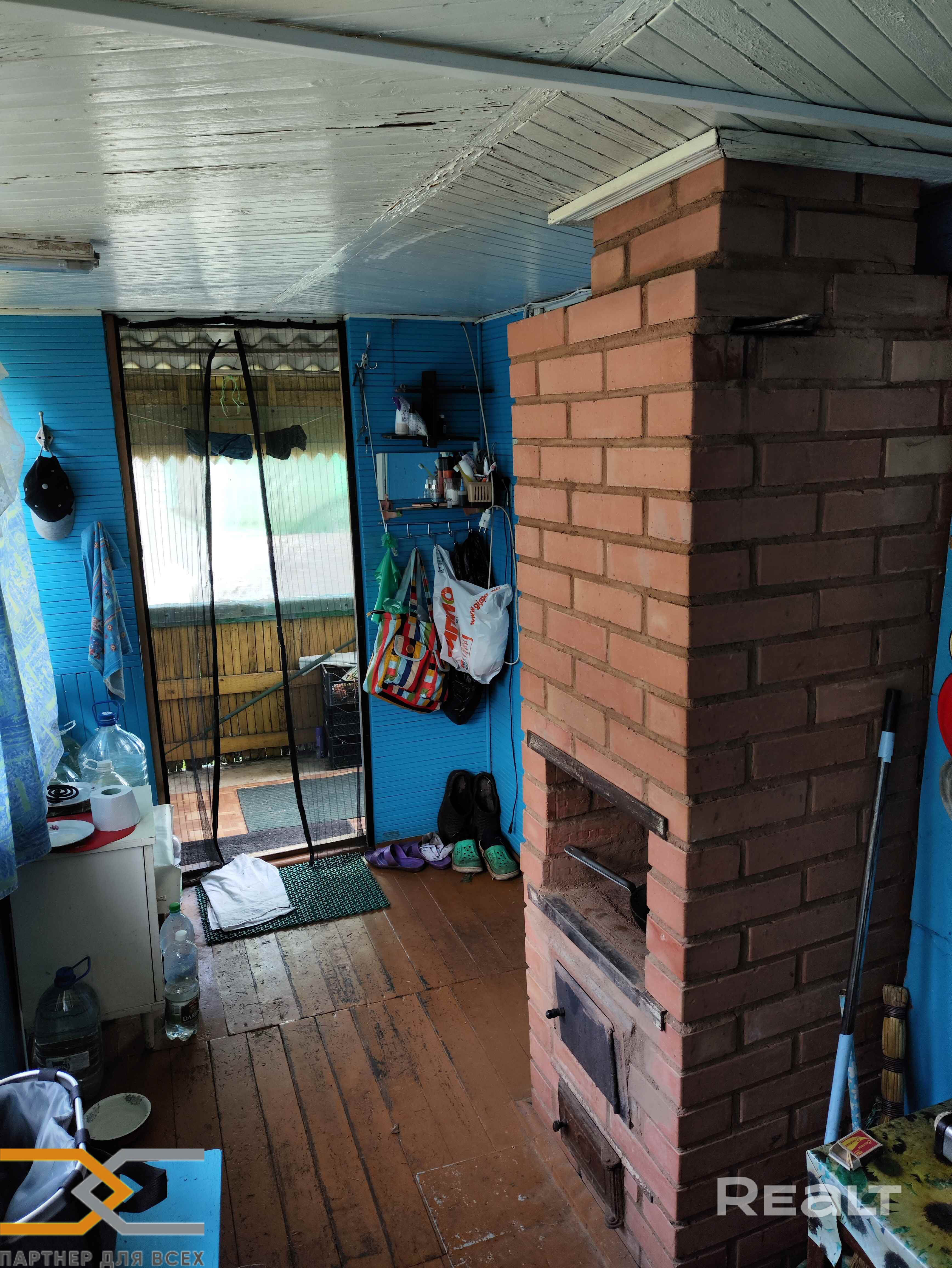 В веранде потолки из декоративной вагонки, стены окрашены, на полу доска.