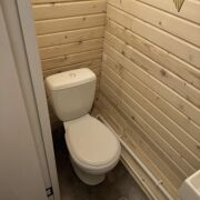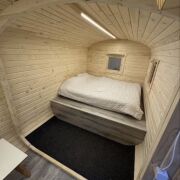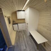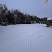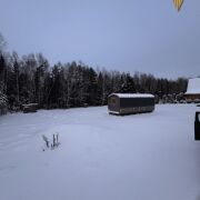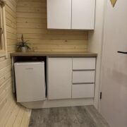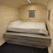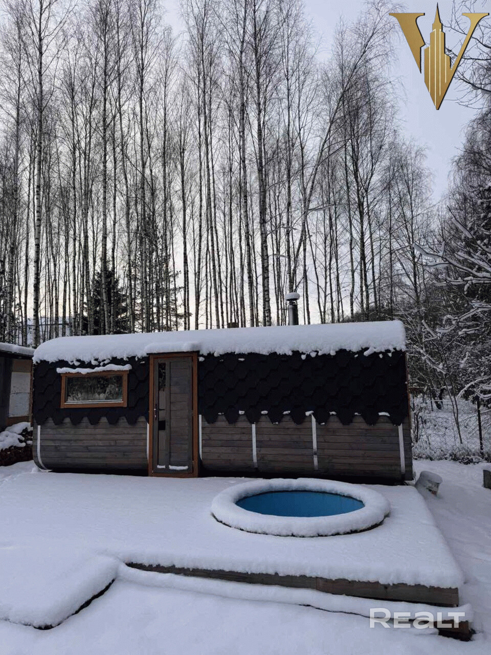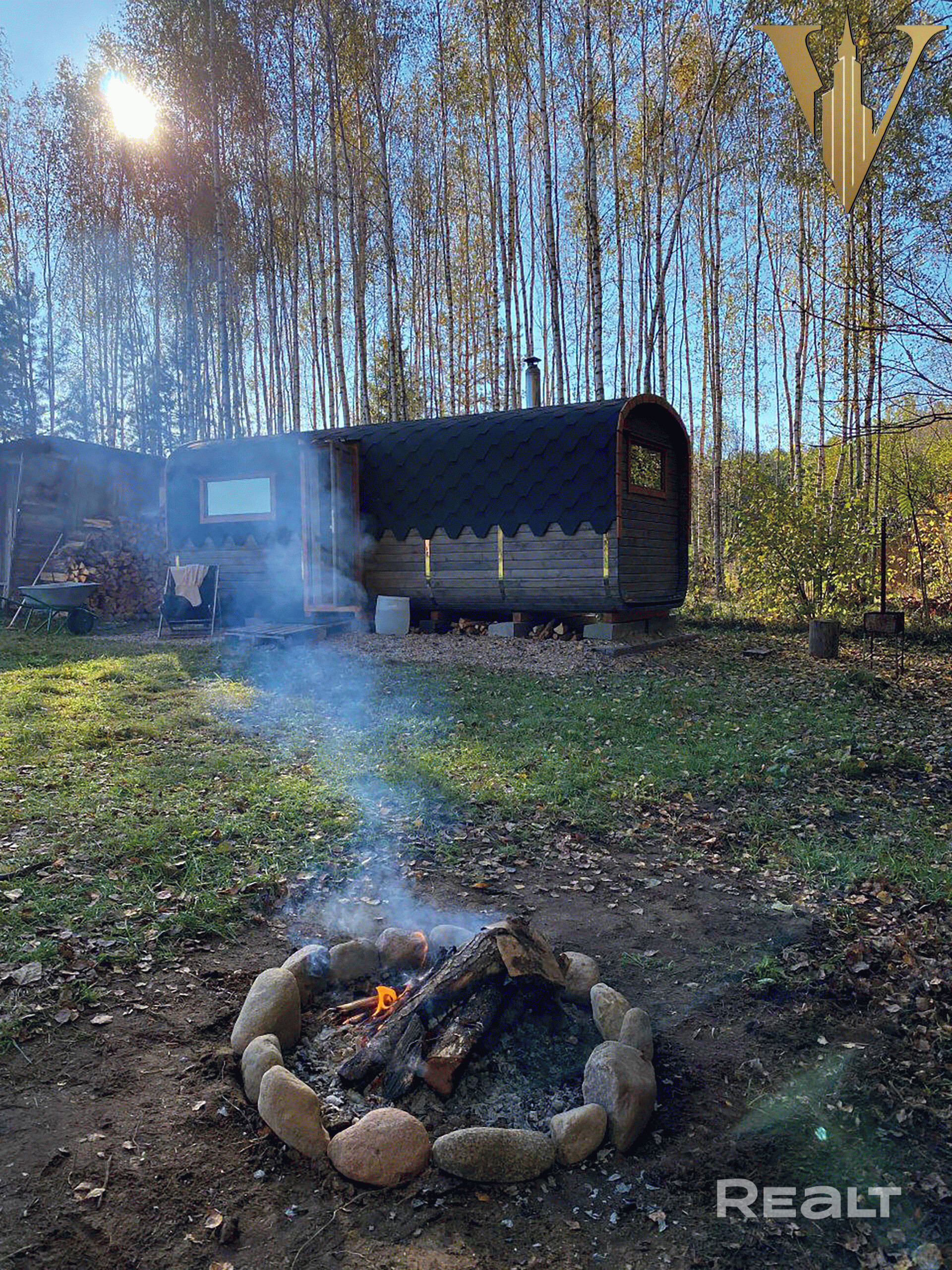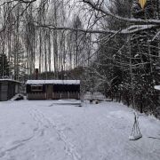 Дом раположен с другой стороны участка и состоит из спальни, кухни и санузла. Из дома открывается потрясающий вид на березовую рощу.