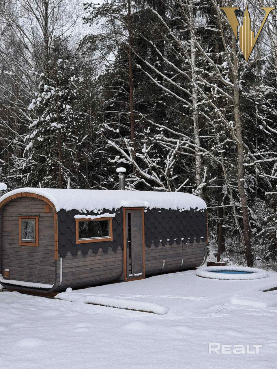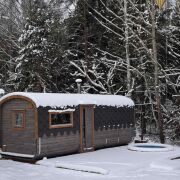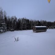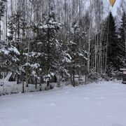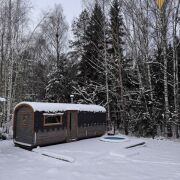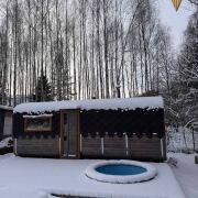 Баня с террасой и купелью расположена у самого леса.