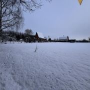 Учаток правильной прямоугольной формы, выровнен и огорожен с трёх сторон.