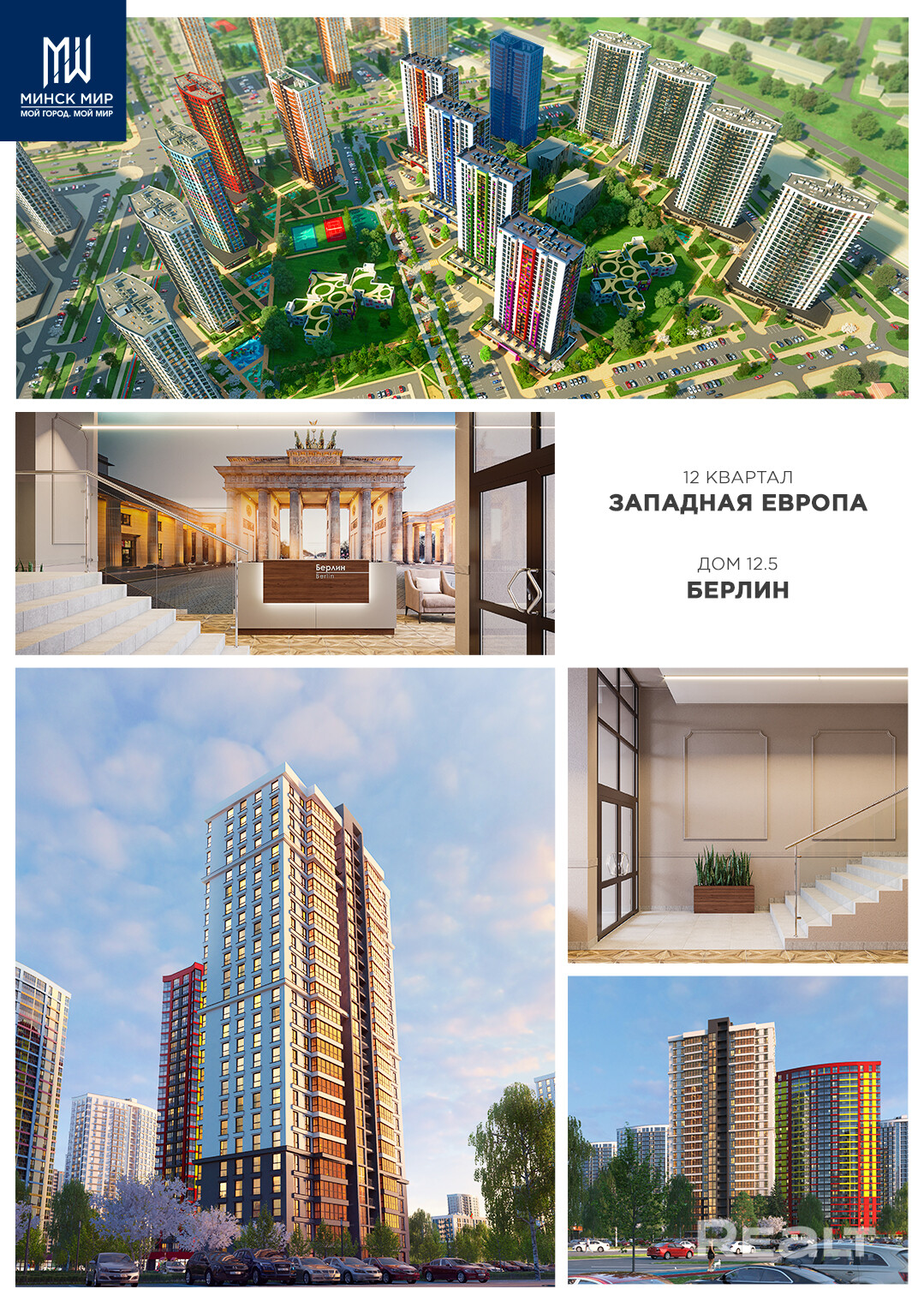 «Берлин» — 25-этажный одноподъездный дом из квартала «Западная Европа» многофункционального комплекса Minsk World. Жители первых этажей этого дома, где высота помещений составит от 2,87 м до 3,72 м, будут иметь обособленные, защищённые от атмосферных осадков индивидуальные входы в свои квартиры с террас.