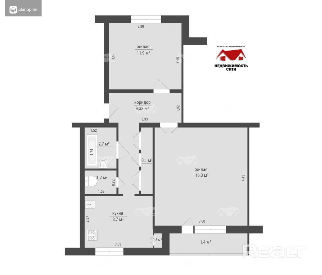 Общая площадь квартиры составляет 51.3 кв.м., из которых 27.9 кв.м. жилая площадь и 8.7 кв.м. кухня.