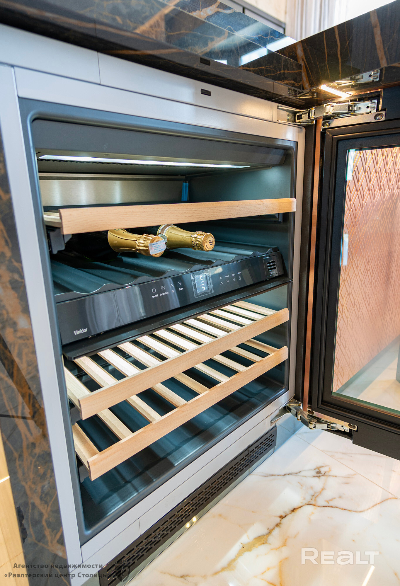 В квартире сделан изысканный ремонт: Квартира выполнена в уникальном дизайнерском решении с использованием только самых высококачественных материалов. На полу – натуральная деревянная доска, которая придаёт помещению тепло и элегантность. Санузлы оформлены с использованием эксклюзивной плитки и высококачественной сантехники, что создаёт атмосферу настоящего уюта и роскоши. Современная кухня оснащена высококачественной техникой: Духовой шкаф и посудомоечная машина фирмы Bosch, известные своей надежностью и долговечностью, обеспечивают идеальные условия для приготовления и уборки; варочная панель – Falmec, сочетает в себе стильный дизайн и высокую функциональность; винный шкаф – Vinidor, идеально подходящий для хранения ваших любимых вин в оптимальных условиях.