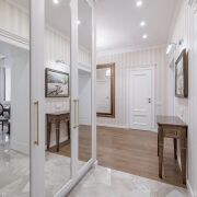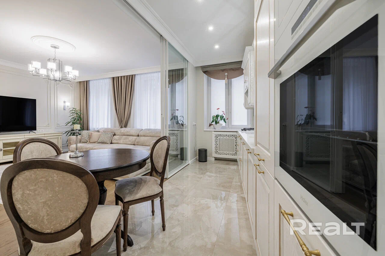 В квартире выполнена премиальная отделка по авторскому дизайн-проекту в классическом стиле, кухонный гарнитур и мебель изготовлена по индивидуальному заказу из натурального дерева. В наличии вся необходимая бытовая техника. На полу дубовый паркет и испанская плитка. Ремонт 2024 года.