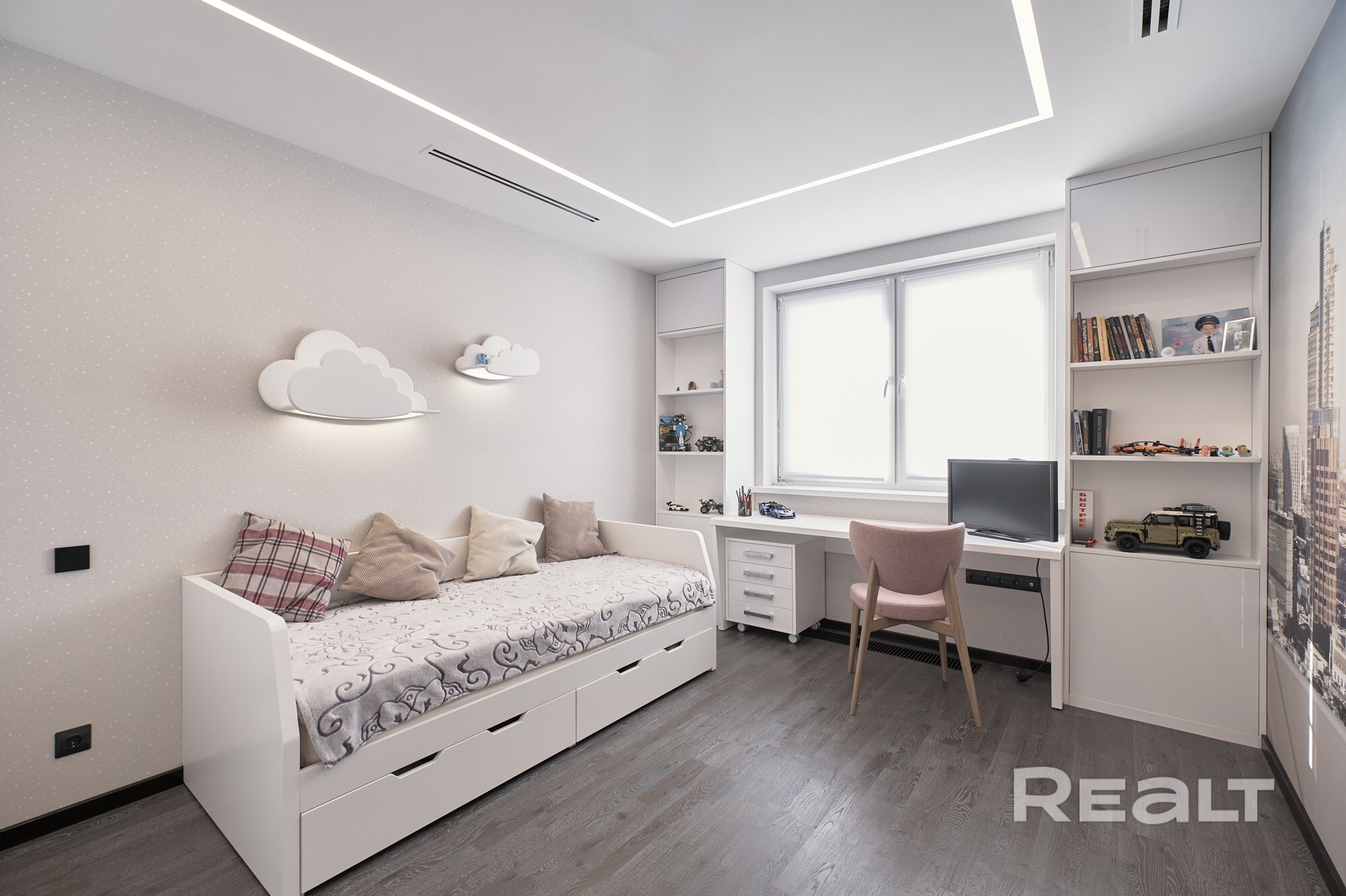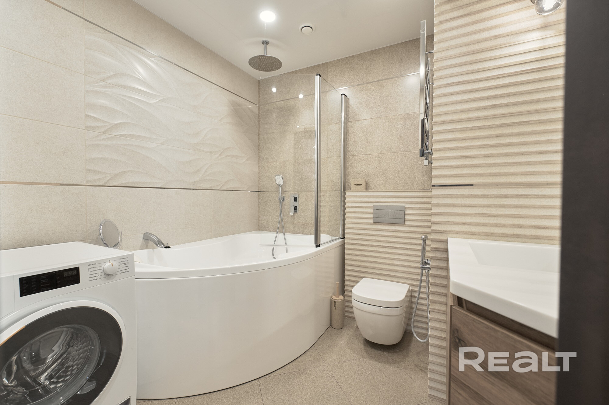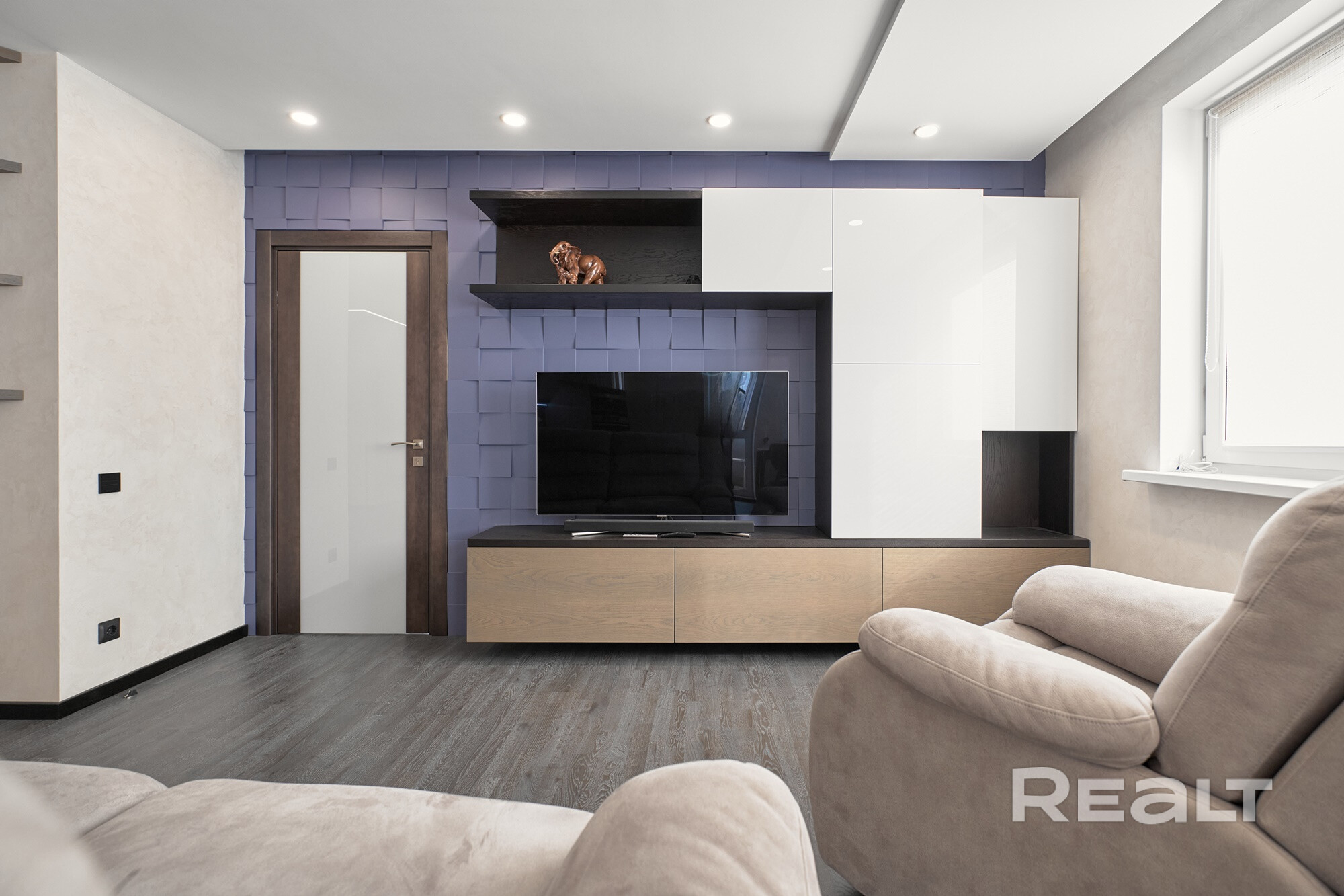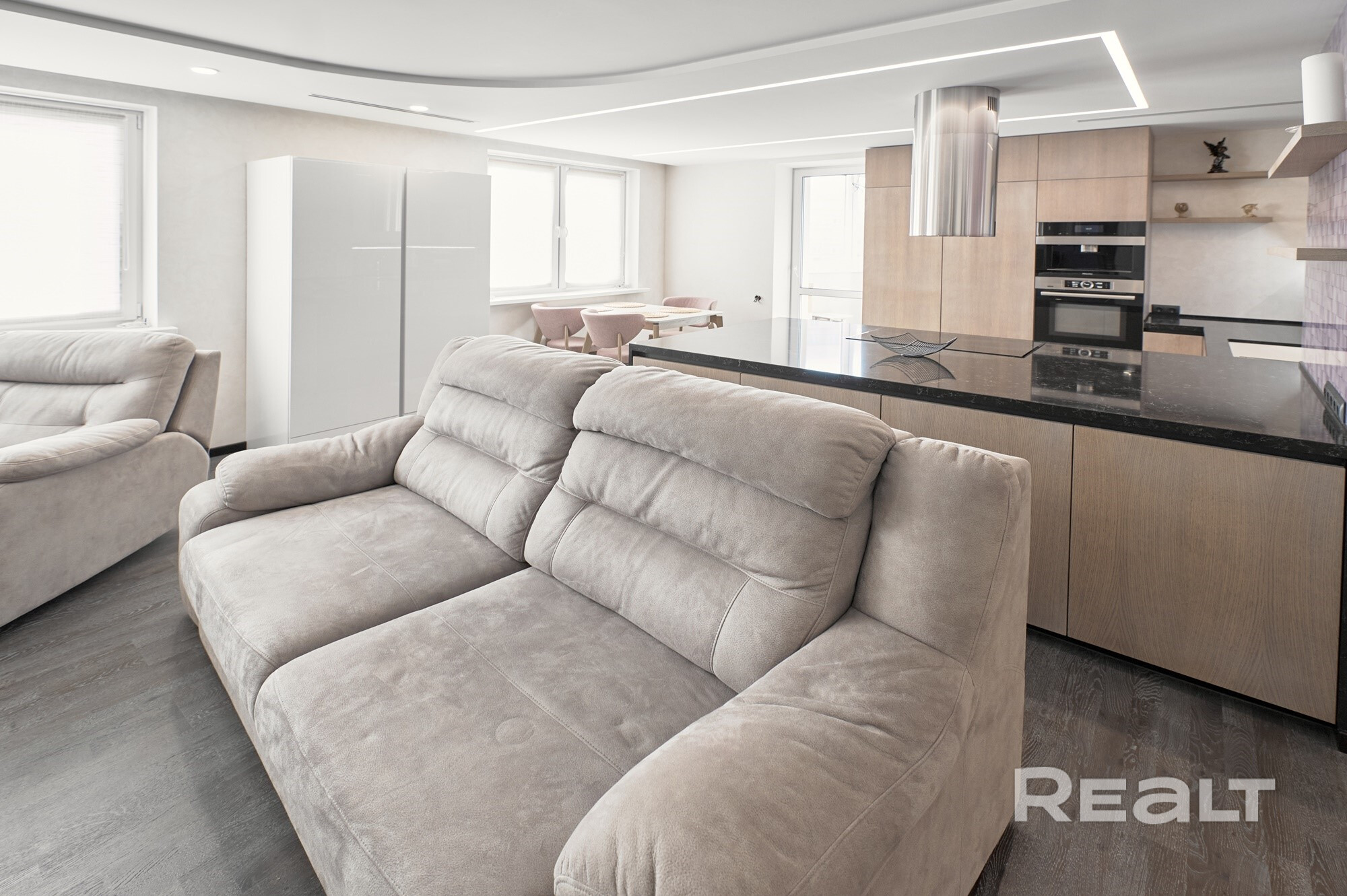 Современный ремонт, выполненный по дизайн-проекту с использованием качественных строительных материалов и оборудования. Все элементы изготовлены по индивидуальному заказу.