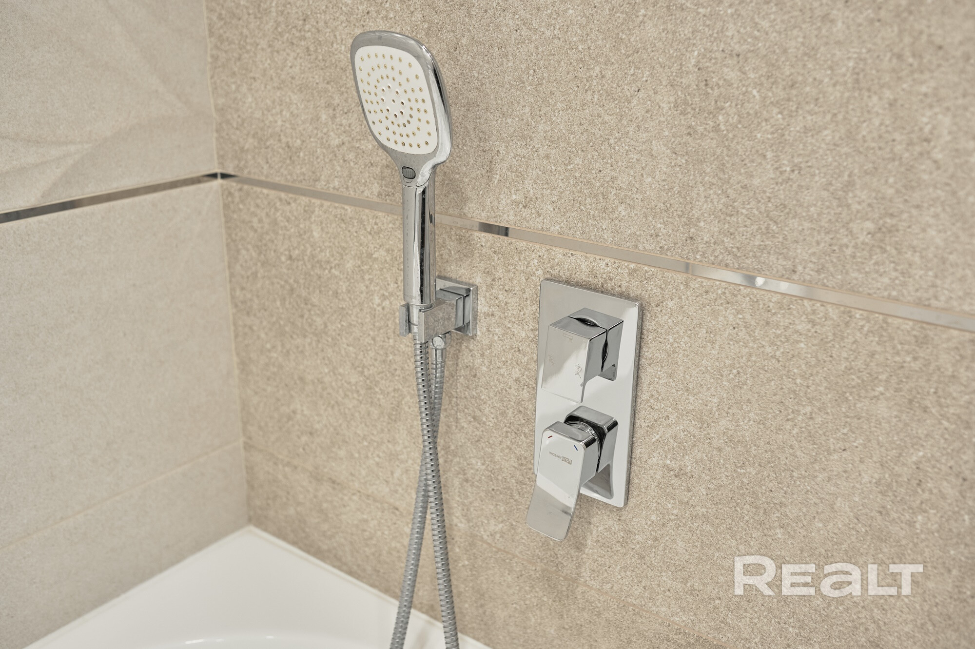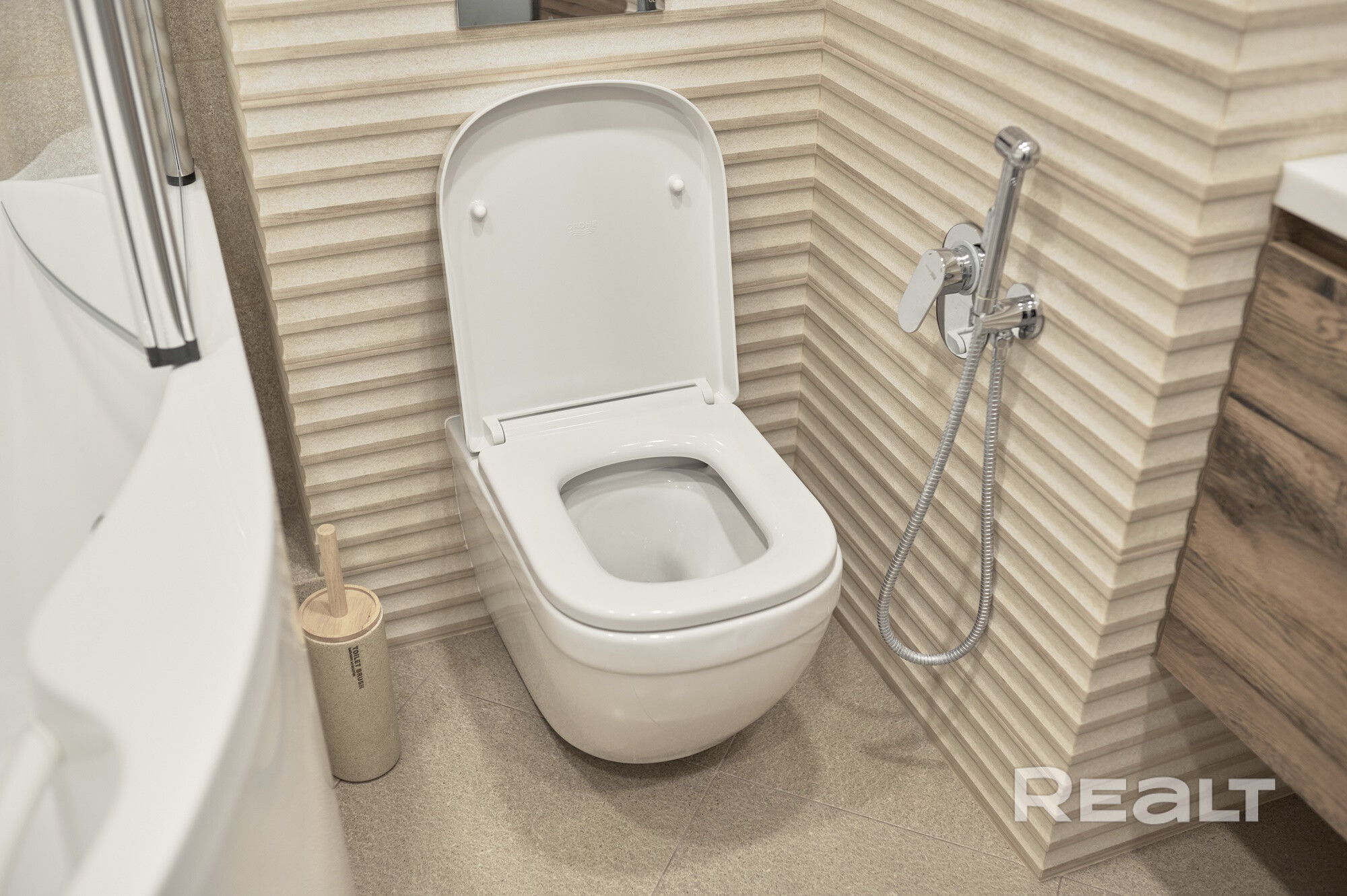 В санузлах вся сантехника Grohe. Угловая ванна Kolpasan, раковина из искусственного камня.