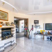Гостиная с камином, отделанным натуральным камнем, станет идеальным местом для уютных вечеров. Хрустальная люстра добавляет изысканности и шарма.