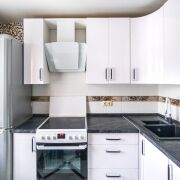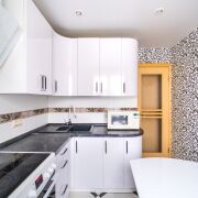 - Кухня облицована плиткой, встроенный кухонный гарнитур, встроенная техника.