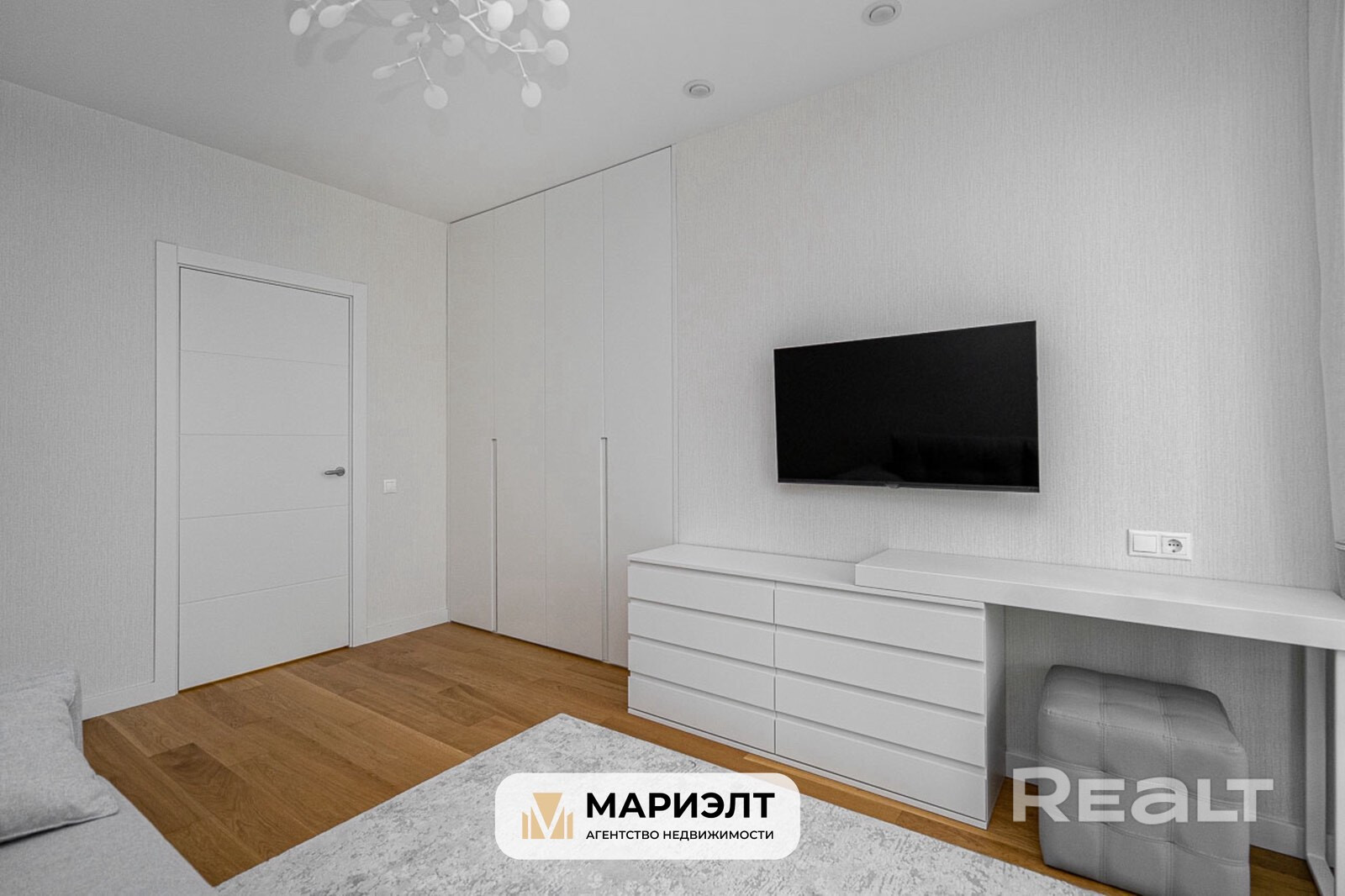 Интерьер квартиры выполнен в спокойной тёплой цветовой гамме. Отсутствие излишних деталей и элементов, наличие натуральных отделочных материалов, грамотные и удобные планировочные решения - всё это создаёт атмосферу уюта и комфорта. В отделке помещений и мебели использованы только премиальные экологически чистые, сертифицированные материалы ведущих европейских производителей, в том числе, вся бытовая техника.