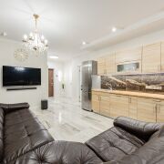 Просторная кухня оборудована индукционной варочной поверхностью и духовкой Electrolux, посудомоечной машиной Ariston, санузлы оборудованы эксклюзивными раковинами от всемирно известного бренда Villeroy & Boch.