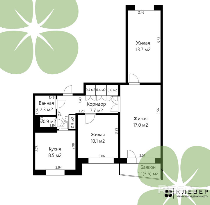 Комнаты 17,0 / 13,7 / 10,1 кв.м