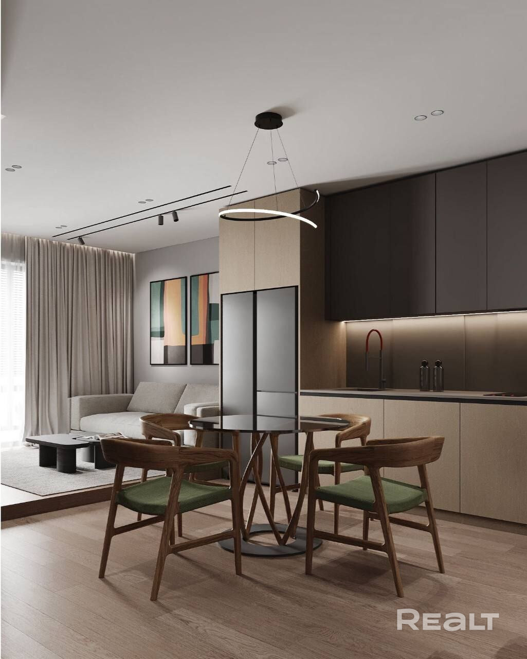 Удобная планировка квартиры: Просторная кухня-гостиная, спальня, детская комната, кабинет, 2 санузла (гостевой и личный), лоджия.