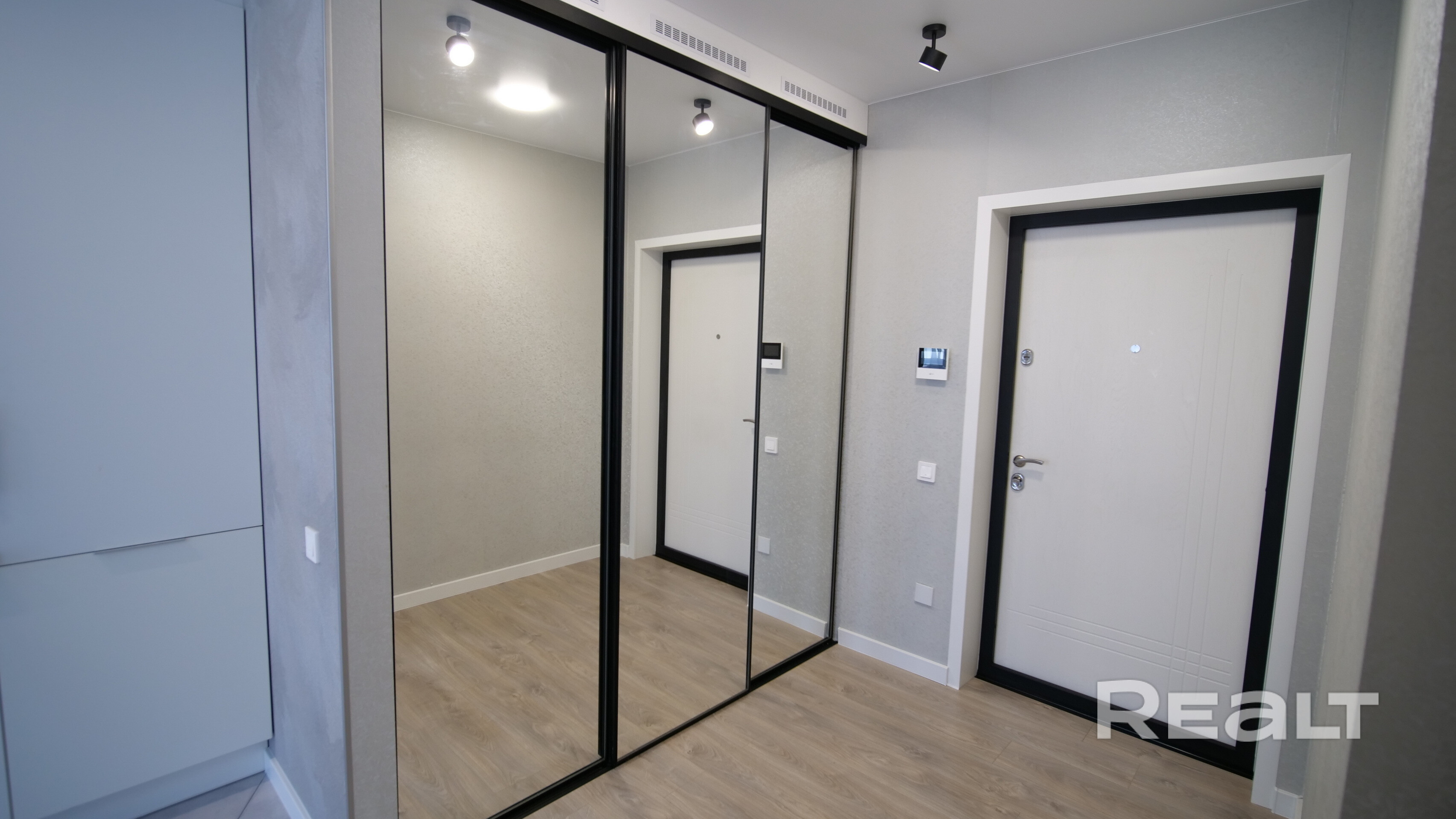 Просторный холл 8 м2 с зеркальным шкафом-гардеробом.