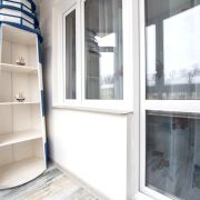 Серую сдержанную спальню украшает окно в пол с патио-системой и выходом на уникальную лоджию, облицованную керамогранитом под оникс. Большая вертикальная батарея, теплый пол и двойное утепление лоджии сделает ваш отдых глубоким и приятным.