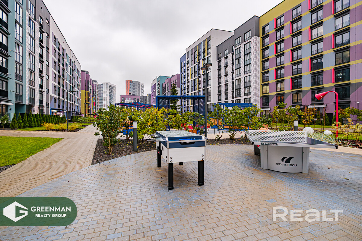 Развитая инфраструктура района: кафе, магазины, 4 детских сада, школы, спортивные и медицинские учреждения, места выгула домашних животных. Удачное расположение дома: не в центре плотной застройки, а прямо у центрального парка.