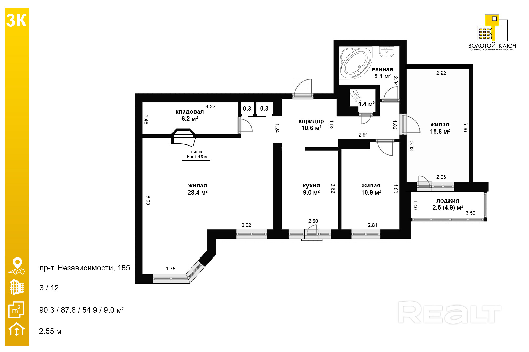 Общая площадь — 90,3 м2, жилая — 54,9 м2, кухня — 9 м2, потолки 2,55 м.