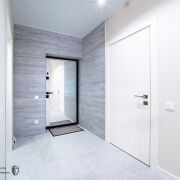 Металлическая входная дверь, на полу уложены плитка и ламинат, натяжные потолки, стильная плитка в санузле.
