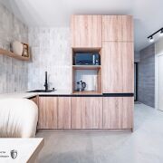 Кухня оборудована встроенной мебелью и укомплектована бытовой техникой, обустроена спальная зона и зона отдыха, а так же места для хранения с продуманной организацией внутреннего пространства.