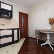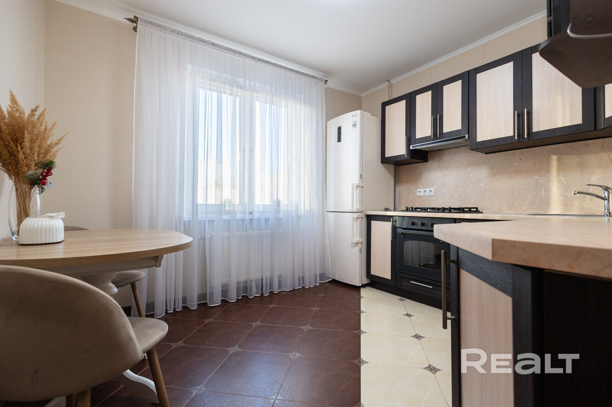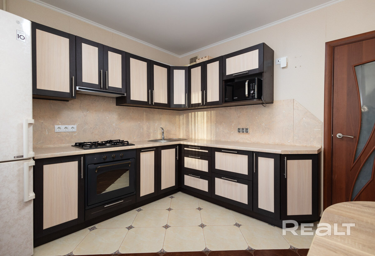 Кухня оборудована: духовой шкаф, газовая варочная поверхность, вытяжка, удобные шкафы.