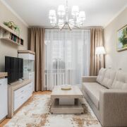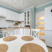 - Кухня оборудована гарнитуром из массива и бытовой техникой польского производства. В наличии холодильник, газовая плита, духовой шкаф и встроенная микроволновая печь, что закрывает основные бытовые потребности.
