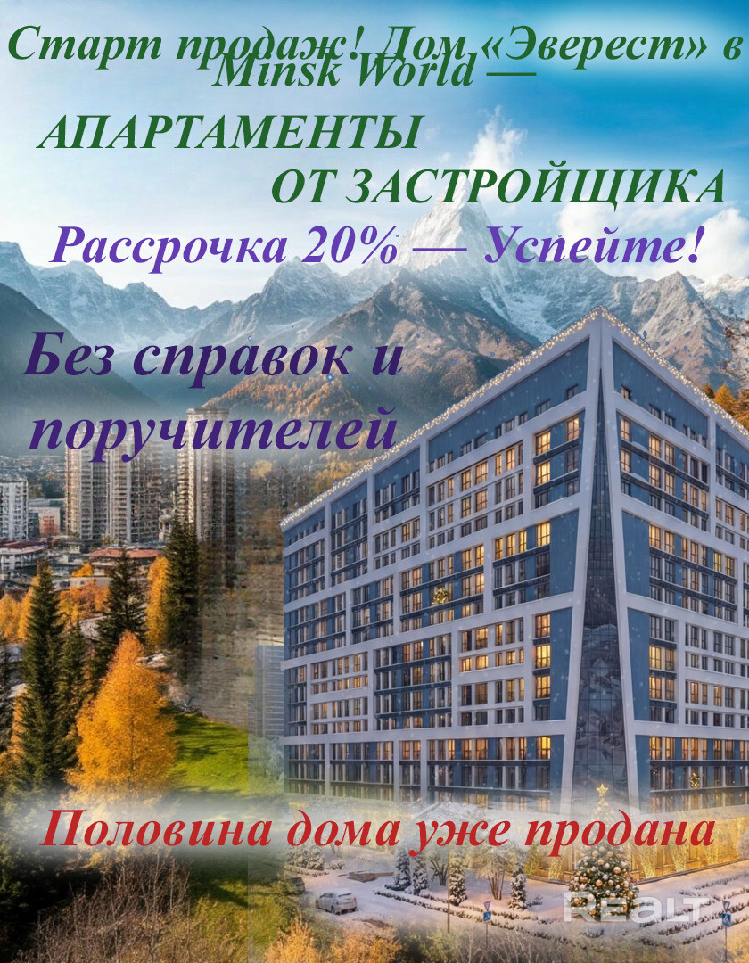 Мечтаете о своей квартире в Минске? В доме «Эверест» это реально! Самые выгодные условия на старте продаж. *Цены актуальны на 12.01.2026 . Звоните, рассчитаем ваш график платежей уже сегодня! Условия покупки: 1. Собственные средства. 2. Выгодная рассрочка: Без справок о доходах и поручителей — нужен только паспорт! Индивидуальный расчет платежей.