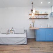 - Квартира выполнена в современном дизайнерском стиле - светлая, продуманная, с выразительной планировкой и четким разделением зон. Пространство включает гостиную, кухню и спальню, создавая ощущение легкости и воздуха. Зона спальни отделена стильной деревянной перегородкой, что придает приватности, но сохраняет ощущение открытого пространства.