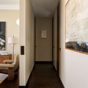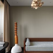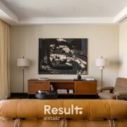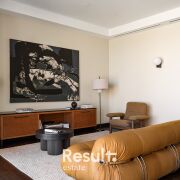 Вы входите — и ощущаете тишину, наполненную мягким светом многоуровневого освещения. В центре пространства — диван Soriana от Cassina, культовый дизайн 1969 г., обрамлённый креслом Brasilia (Audo) и симметричными торшерамиNew Works — изящный пример силового внимания дизайна. Под ногами — благородные породы дерева, на стенах — авторская живопись Алены Гиль.