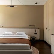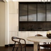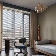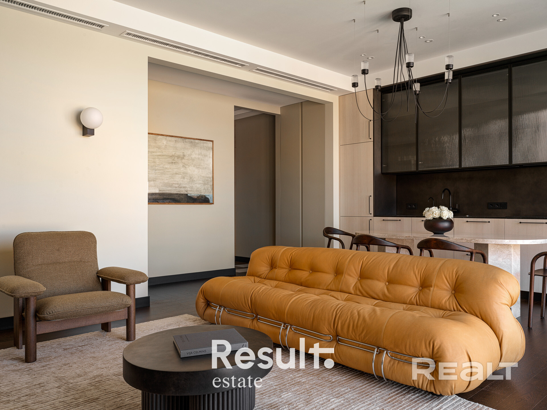 Атмосфера тихой роскоши: благородная палитра песочных, древесных и шоколадных оттенков, авторские светильники Moooi и New Works, мягкие тени, которые меняют настроение пространства в течение дня.