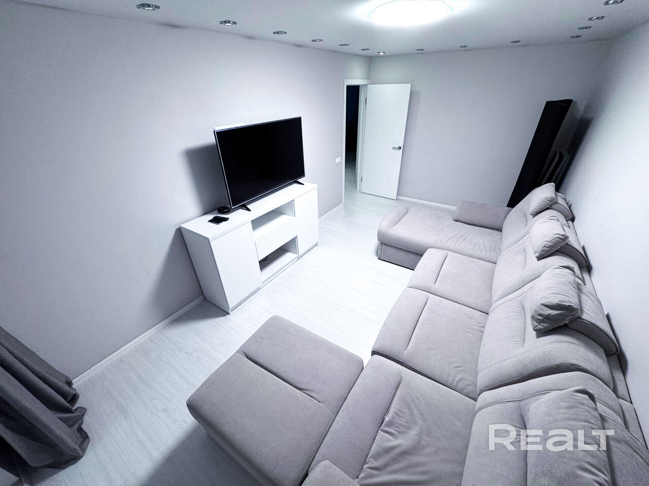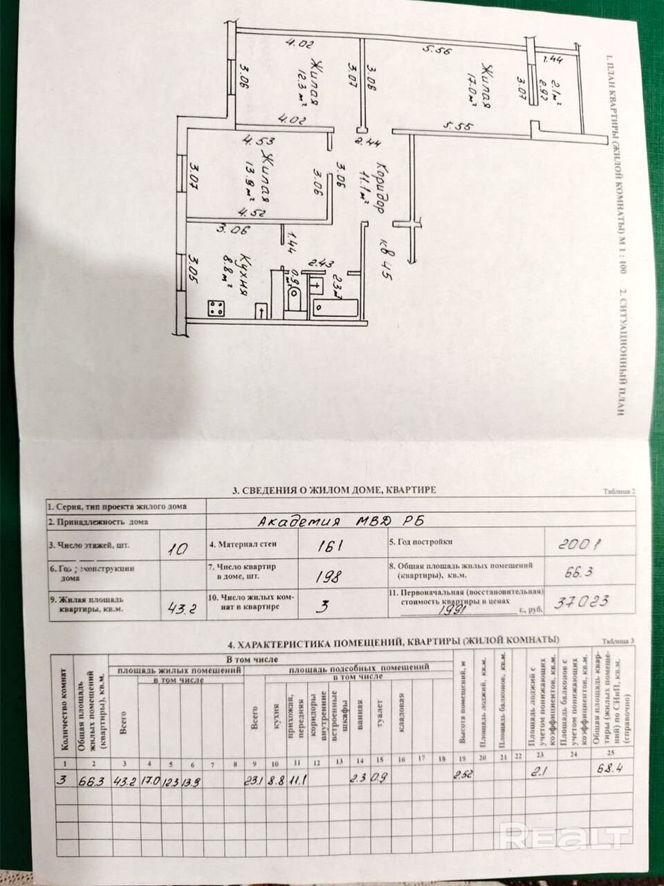 Основные характеристики Общая площадь квартиры — 66,3 м², жилая — 43,2 м², кухня — около 7 м² (по техпаспорту). ​ ​ 3 изолированные комнаты, удобная прямоугольная планировка, раздельный санузел. ​ ​ Этаж 3 из 10, панельный дом 2001 года постройки, серия «Академия МВД РБ». ​ ​ Центральное отопление, водопровод, газ, лифт, стеклопакеты, лоджия. ​ ​ О квартире Светлая гостиная с большим угловым диваном, натяжным потолком с точечным и центральным освещением, выходом на застеклённый балкон. ​ ​