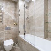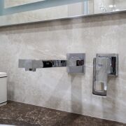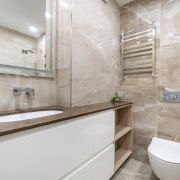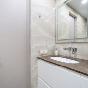• Совмещённый санузел: Сочетает в себе гармонию и практичность. Мраморная столешница, продуманная система хранения и надежная сантехника Grohe делают его стильным и функциональным.