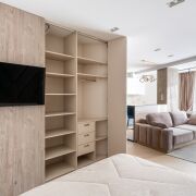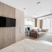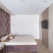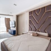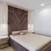 • Спальная зона: Большая мягкая кровать итальянского производства с бархатным изголовьем темно-пыльно-розового оттенка и изящными золотыми рейками создаёт атмосферу уюта. По бокам от кровати расположены две тумбочки с мраморной столешницей. Вдоль стены смонтирована цельная система хранения, а при желании помещение позволяет отделить спальную зону от гостиной.