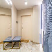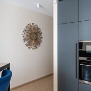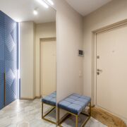 • Светлая входная группа: Акцентные синие шкафы с фасадами, украшенными ритмичными геометрическими фигурами, не только служат для хранения верхней одежды и обуви, но и скрывают бытовую технику. Завершается входная группа стильным зеркалом, которое визуально увеличивает пространство и позволяет быстро проверить внешний вид перед выходом.