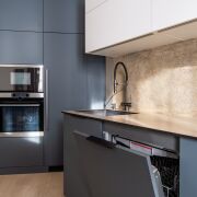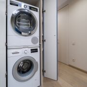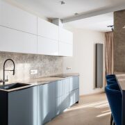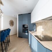 • Кухонная зона: Шкафчики в элегантном сочетании белоснежного и оливково-зеленого цветов имеют гладкие фасады, которые радуют глаз и обладают множеством практичных характеристик: низкое светоотражение, устойчивость к отпечаткам пальцев, влагостойкость, термостойкость и ударопрочность. Кухня оснащена техникой от брендов AEG и Bosch, а встроенный холодильник и морозильник предлагает достаточно пространства для хранения продуктов.